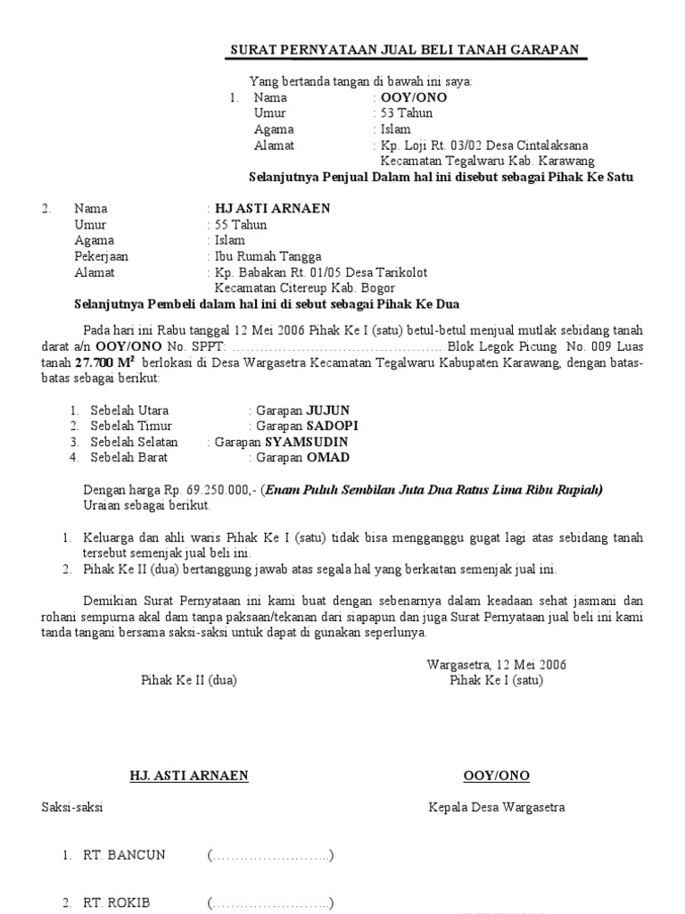 Tanah warisan ini tentu berbeda dengan tanah milik pribadi yang menggunakan nama sendiri. Demikian surat perjanjian jual beli tanah ini dibuat dengan penuh kesadaran dan tanpa paksaan antara para pihak dan dipatuhi sebagai hukum yang mengikat para pihak. Membeli tanah kebun memang lumayan menguntungkan karena tanah tersebut sudah bisa langsung digarap dan. Membuat surat keterangan jual beli memang menjadi keharusan jika kita akan melakukan transaksi. Surat perjanjian jual beli tanah. Fungsi dari surat jual beli kebun ini bersifat sama dengan surat jual beli tanah pada umumnya yaitu sebagai bukti tertulis bahwa transaksi jual beli diatas adalah contoh dari surat jual beli tanah berupa kios yang bisa anda gunakan sebagai referensi atau acuan jika anda ingin membuat surat. Penjual menyerahkan sebidang tanah kepada pembeli sesuai dengan ukuran yang tertera pada surat jual beli dan pembeli. #jualbelitanah #aktajualbeli #perjanjianjualbelicontoh surat perjanjian jual beli tanah ini tentunya sangat berguna bagi anda yang hendak menjual maupun. Dengan demikian tidak ada yang bisa melanggar aturan yang sudah dibuat oleh kedua belah pihak dalam hal jual beli. Contoh surat perjanjian/keterangan jual beli kebun sawit dan tanah berikut ini adalah contoh tentang contoh surat perjanjian/keterangan j. Adapaun contoh dari surat jual beli tanah dapat dilihat sebagai berikut kebun juga merupakan salah satu tanah yang sering dijual oleh pemiliknya. Yang bertanda tangan dibawah ini: Surat jual beli tanah merupakan sebuah surat yang dibuat yang mana isi dari surat tersebut menginformasikan bahwasanya pada tanggal dan waktu tertentu telah dilakukan akad atau transaksi jual beli tanah antara pihak pertama dengan pihak kedua atau juga bisa disebut antara pihak penjual.